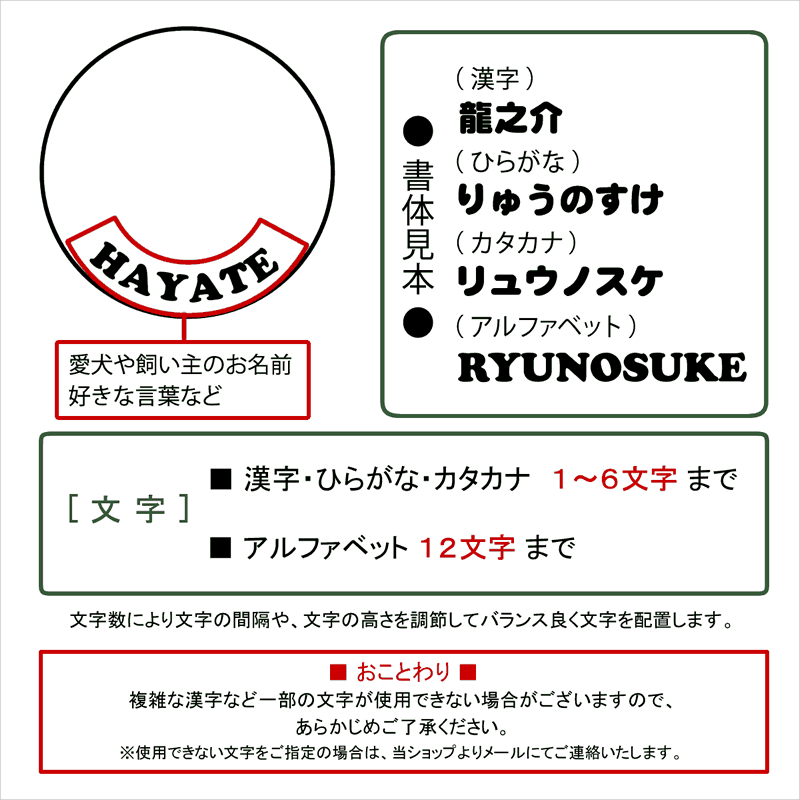 漢字・ひらがな・カタカナ(6文字)、 又は、 アルファベット(12文字)まで。