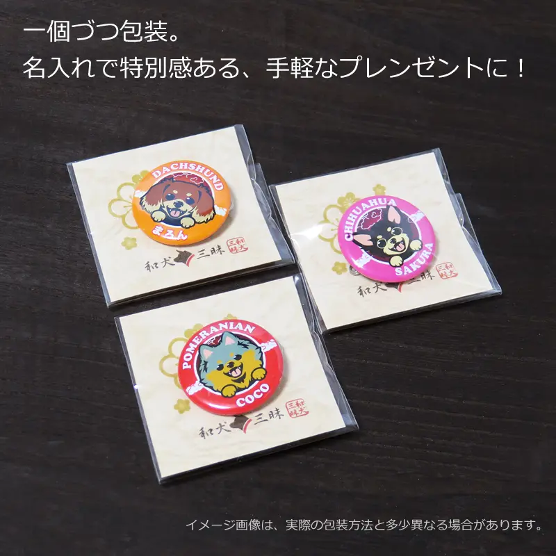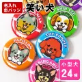 お名前 缶バッジ(小型犬 笑い犬) 32mm 名前や好きな言葉が名入れできる缶バッジ。小型犬イラストは、ロングやスムースなど、毛の長さ・模様でデザインを選べます。バッグや帽子のワンポイントアクセサリーとしても可愛い。プレゼントにもおすすめのグッズです。