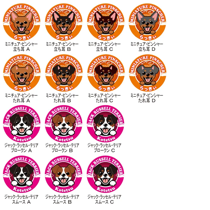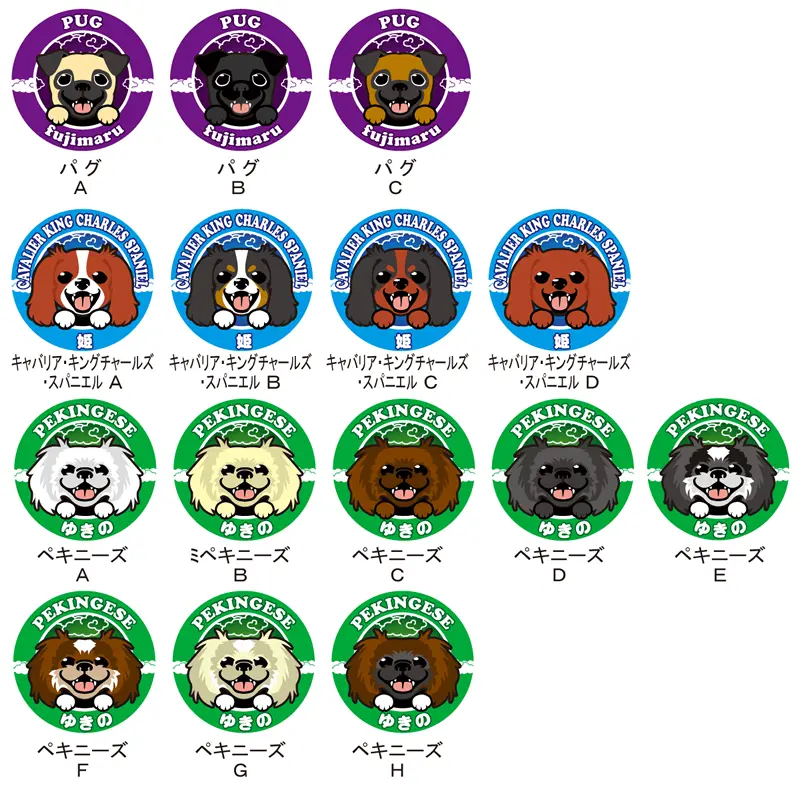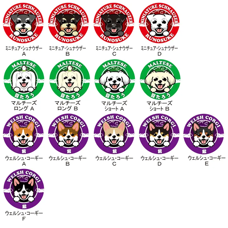 犬種名とデザインタイプ(犬種名の脇のアルファベット)で、ご希望のデザインをご指定下さい。 ※犬種によってデザインタイプ数が異なります。