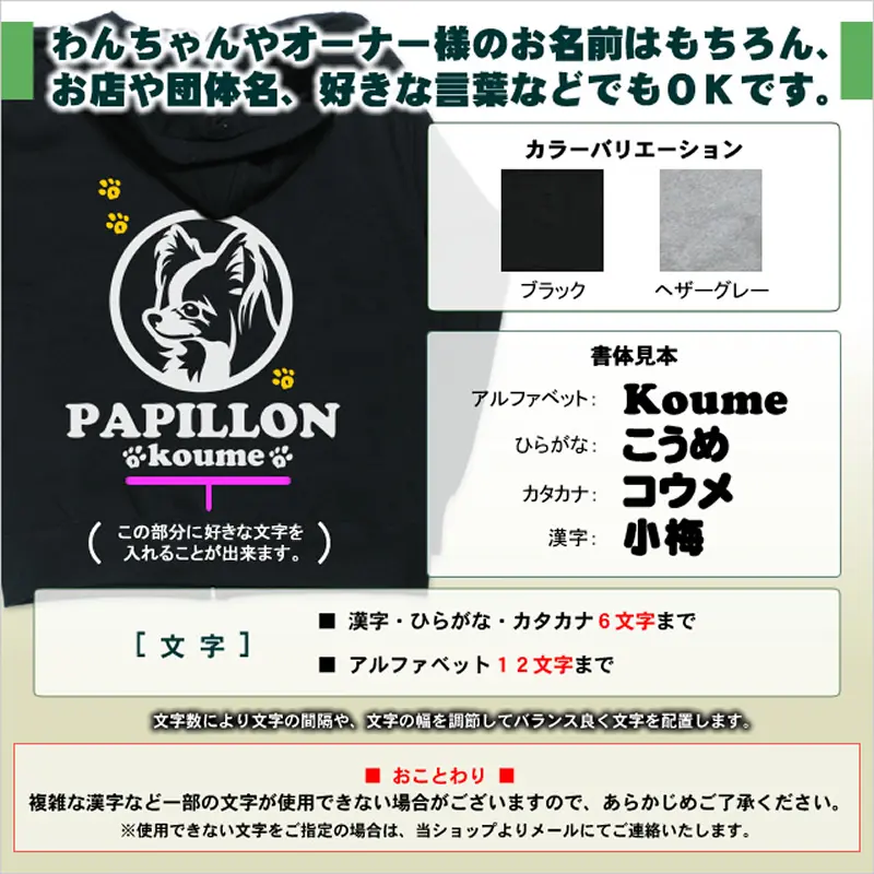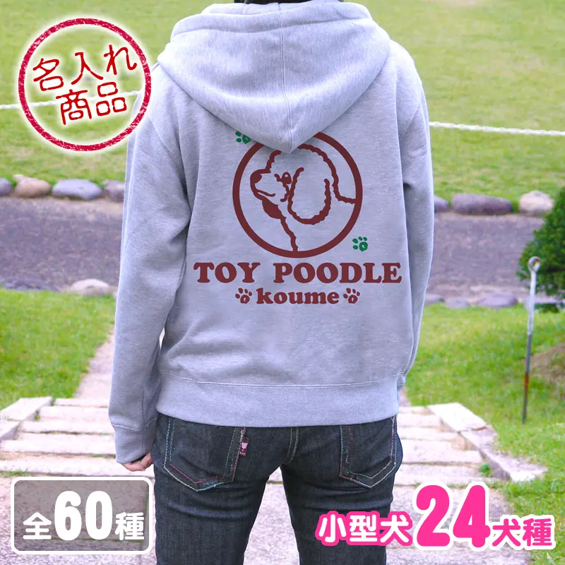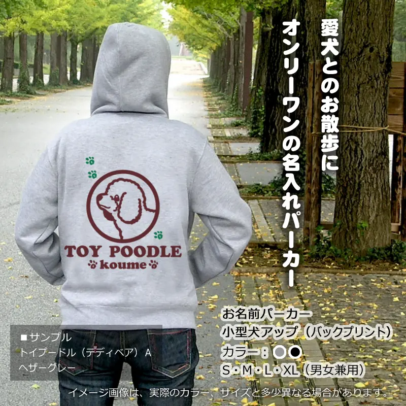 ![]() ![]() ![]() お名前パーカー 小型犬アップ(バックプリント) 背中に大きく小型犬の顔と犬種名をプリントした名入れパーカー。デザインを小型犬24犬種から選べます。 愛犬の名前やイニシャルなど、お好きな言葉やメッセージを入れて作成します。プレゼントにもオススメなオンリーワングッズです。 パーカーは、ゆったりスタイルで男女兼用。生地は厚めの10オンス。裏起毛で保温性も高くとっても着やすいです。愛犬とのお散歩やお買い物などにご活用下さい。 ![]() ■ 犬種イラスト 犬種名とデザインタイプ( 犬種名下のアルファベット)をお選び下さい。 ※犬種によって、デザインタイプ数は異なります。 ![]() ![]() ![]() ![]() ![]() <選べる24犬種> トイプードル(テディベア) チワワ ダックスフンド シーズー パグ ヨークシャーテリア(ヨーキー) パピヨン フレンチブルドッグ(フレブル) ミニチュアシュナウザー(ミニシュナ) マルチーズ コーギー(コルギー) ミニチュアピンシャー(ミニピン 立ち耳 たれ耳) ジャックラッセルテリア(JRT) キャバリア ビーグル ペキニーズ シェットランドシープドッグ(シェルティー) ボストンテリア(ボストンブル) アメリカンコッカースパニエル(Aコッカー) イタリアングレーハウンド(イタグレ) 柴犬(黒柴 白柴) 狆 日本スピッツ ■ パーカーカラー ![]() |
