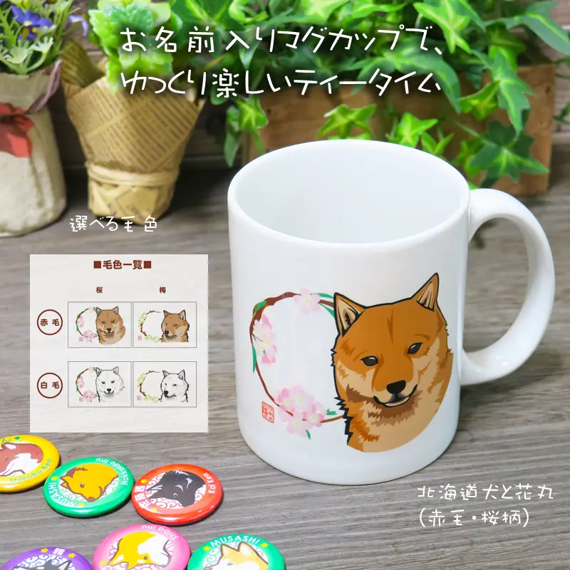 お名前マグカップ 北海道犬と花丸 北海道犬が描かれた、たっぷりサイズのマグカップ。