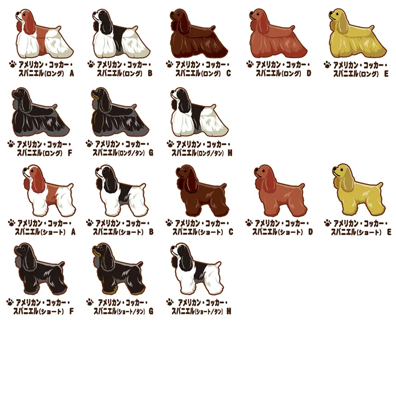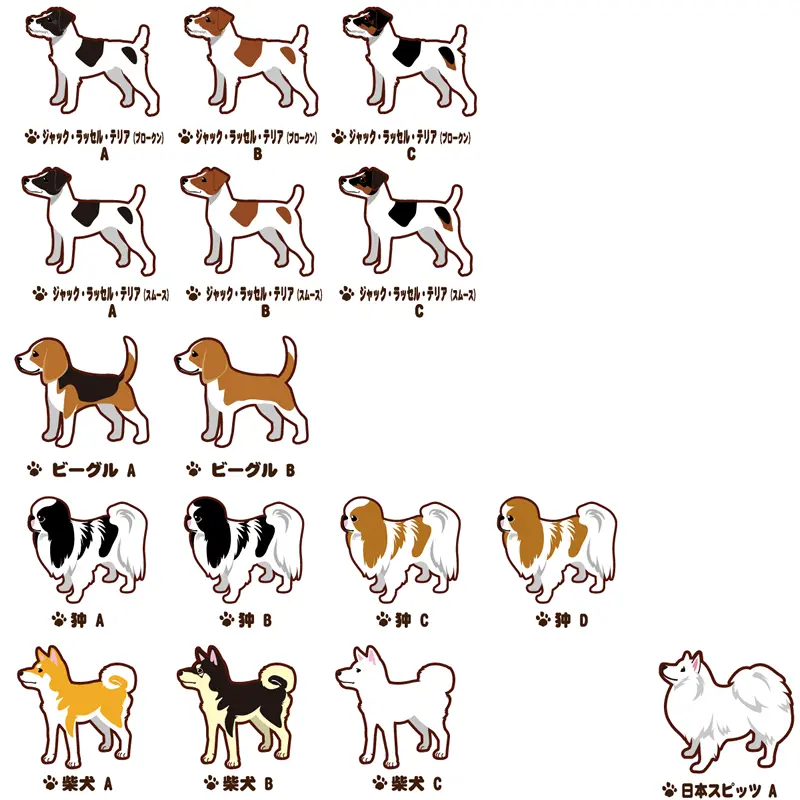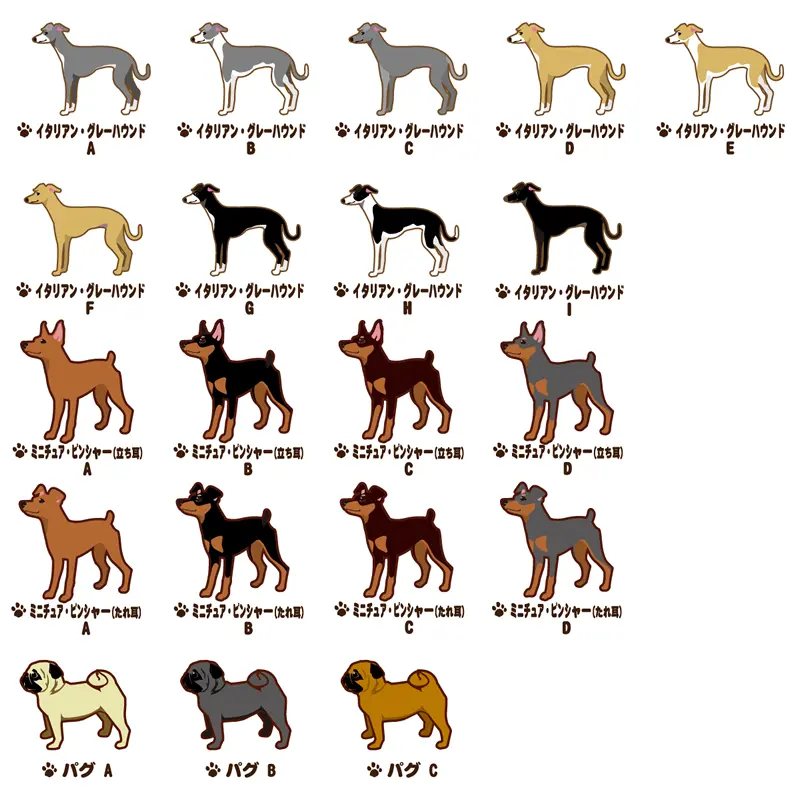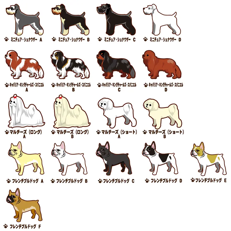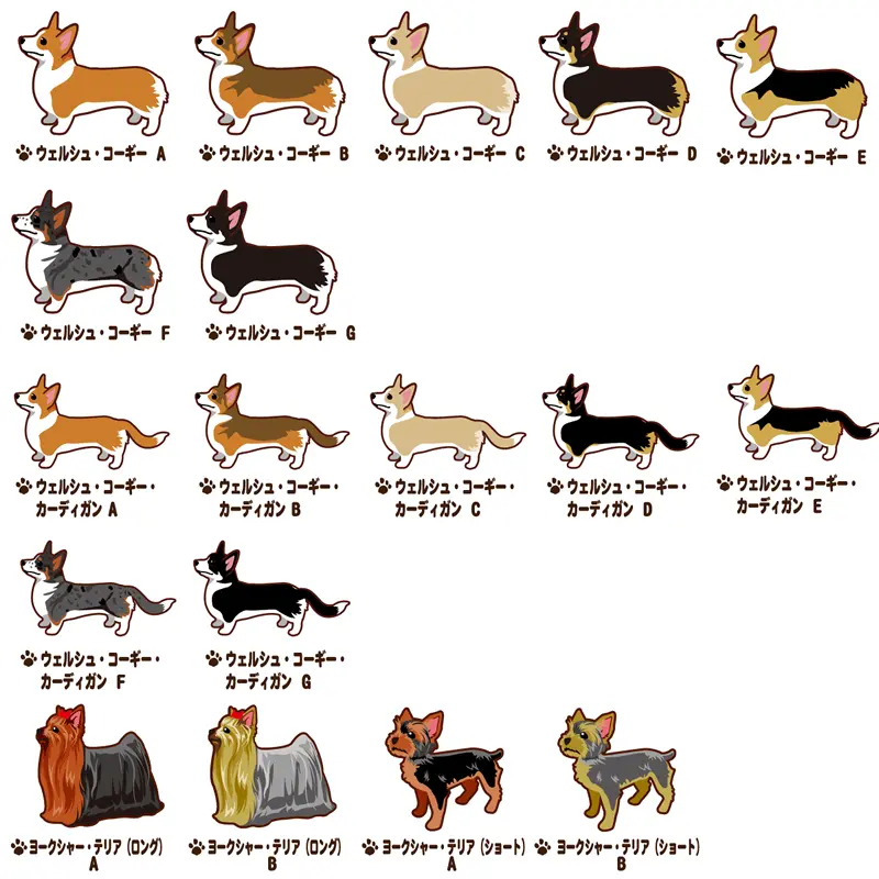 商品画像を参考に「犬種名」と「デザインタイプ( 犬種名下のアルファベット)」をお選び下さい。 ※犬種によって、デザインタイプの数が異なります。