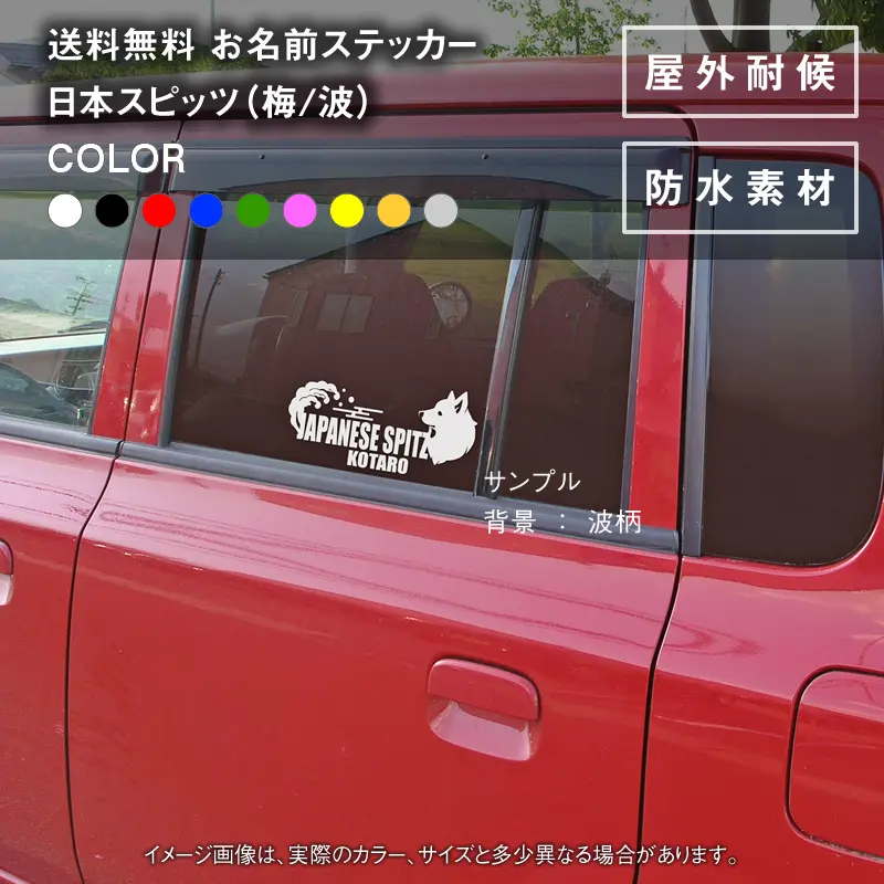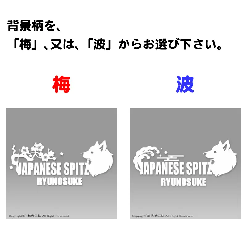 キリリとしたカッコいい日本スピッツのイラストが魅力的なカッティングステッカー。背景は「梅」と「波」から選べる和風デザイン。名前や好きな言葉を漢字やひらがなでも名入れ可能なので、車に貼れば個性的な印象をプラスでき、オリジナル感たっぷりです。愛犬好きな方へのプレゼントにもぴったり。日本スピッツの魅力を存分にお楽しみください。
