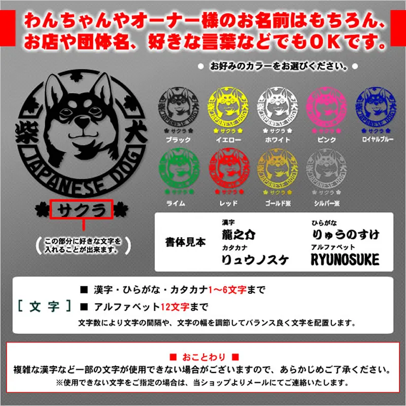 黒柴の顔が大きくデザインされた名入れステッカー。愛犬の名前やイニシャルなど、お好きな言葉やメッセージを入れてお届けします。車や玄関、犬小屋などに貼ってお楽しみ下さい。プレゼントにもオススメなグッズです。