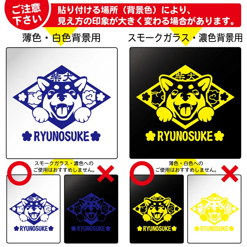 貼りつける場所(背景色)に合わせ、「薄色・白背景用」、又は、「スモークガラス・濃色背景用」をお選びください。