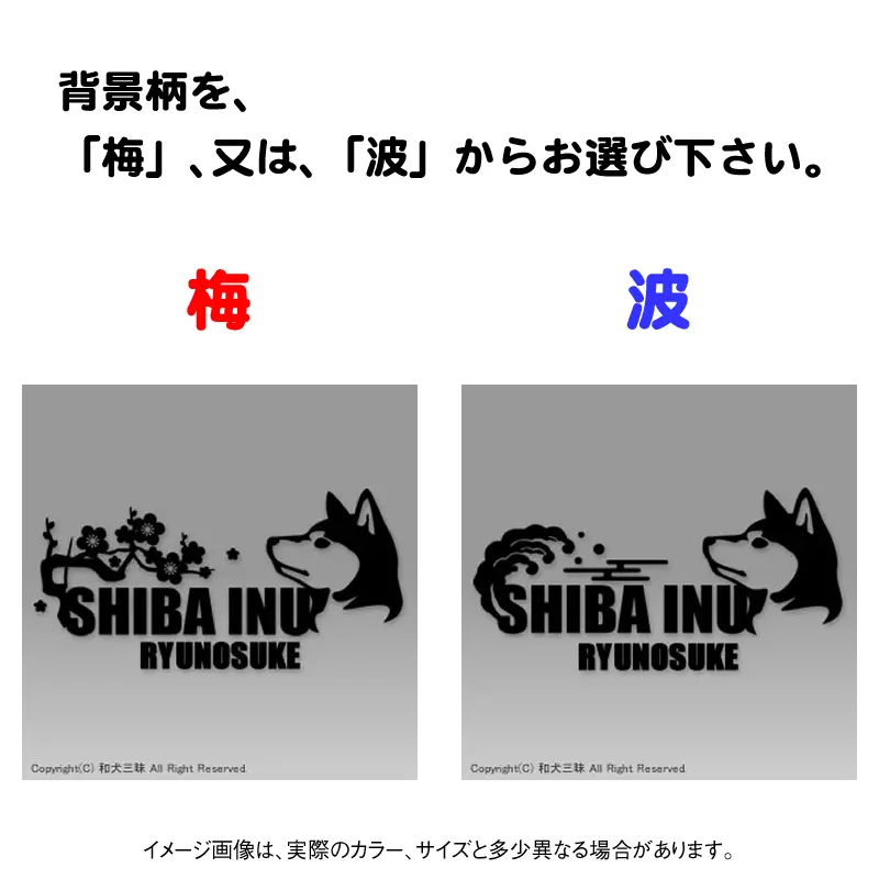 キリリとしたカッコいい柴犬のイラストが魅力的なカッティングステッカー。背景は「梅」と「波」から選べる和風デザイン。名前や好きな言葉で名入れも可能なので、車に貼れば個性的な印象をプラスでき、オリジナル感たっぷりです。愛犬好きな方へのプレゼントにもぴったり。柴犬の魅力を存分にお楽しみください。