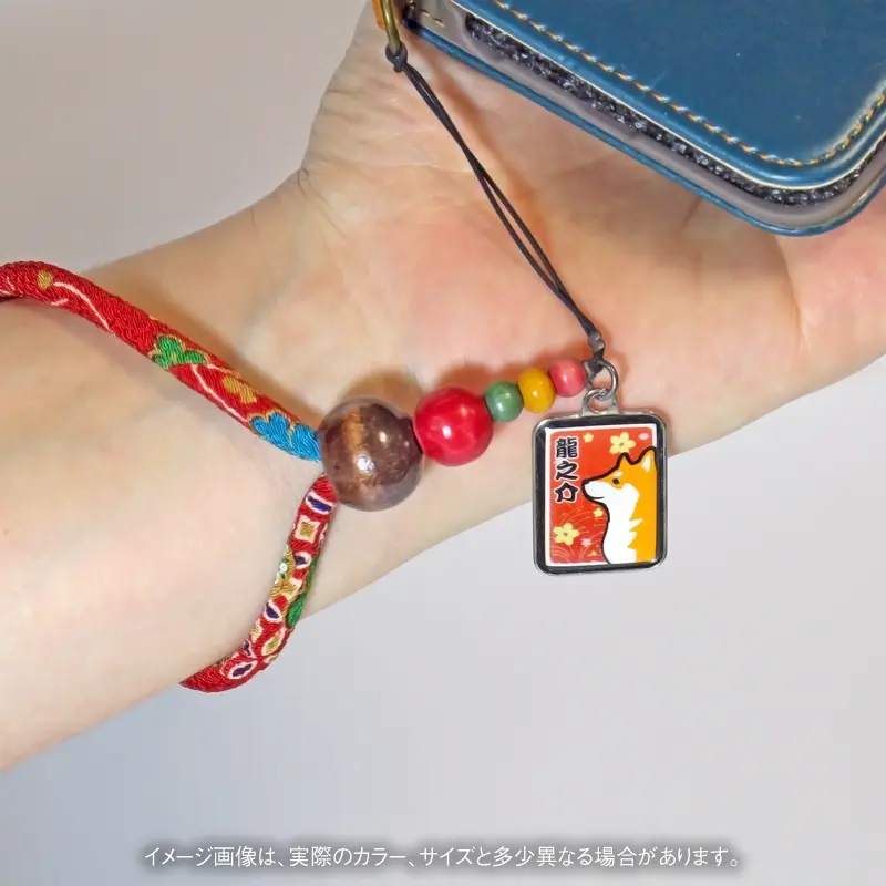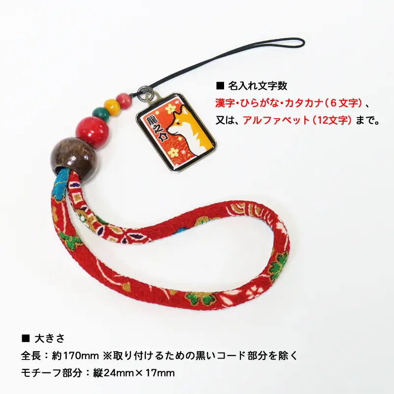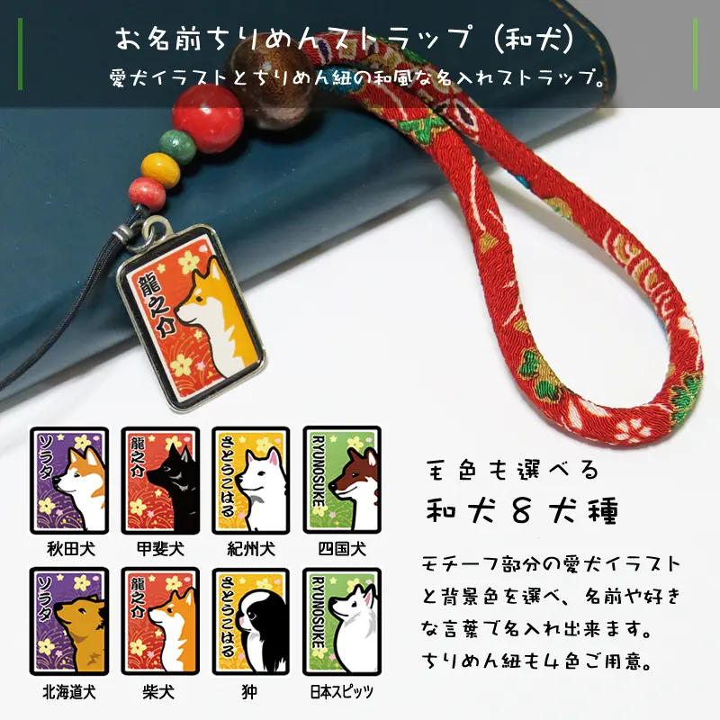 愛犬イラストとちりめん紐&ウッドビーズの和風な名入れストラップ。名前や好きな言葉で名入れ出来ます。プレゼントにもおすすめのグッズです。