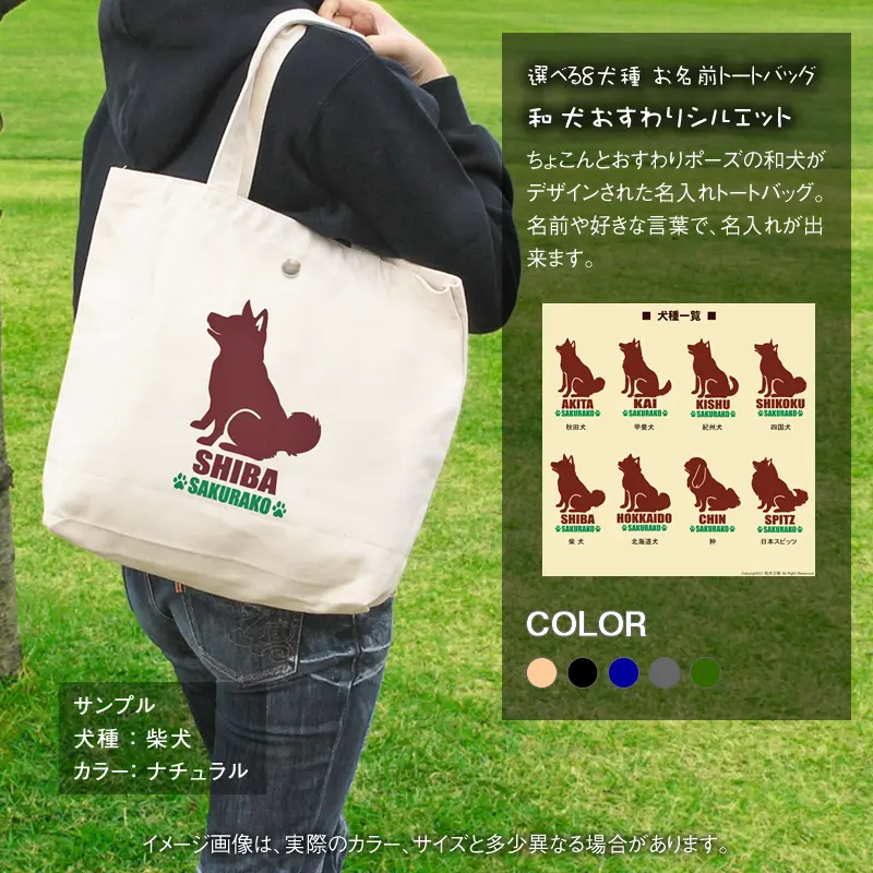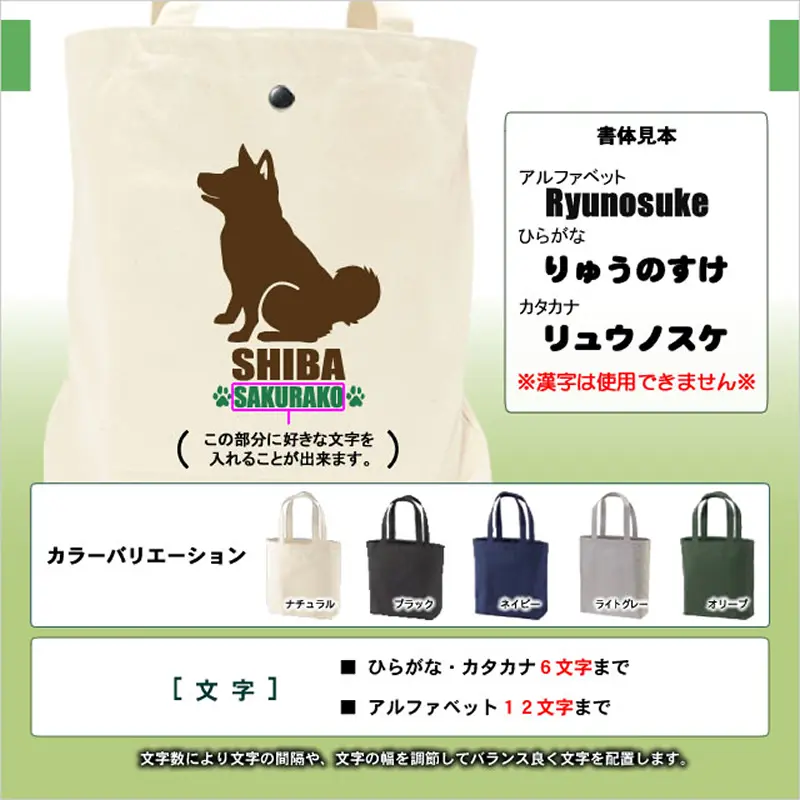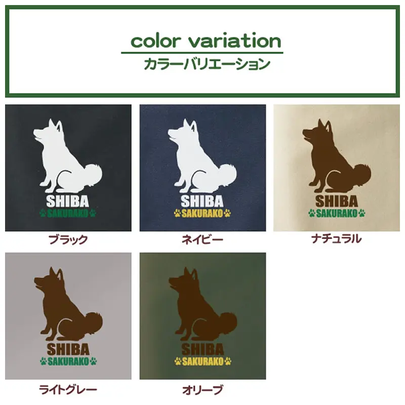 ちょこんとおすわりポーズの和犬がシンプルにデザインされたオリジナル名入れトートバッグ。日本犬8犬種の中からご希望の犬種デザインをお選びください。