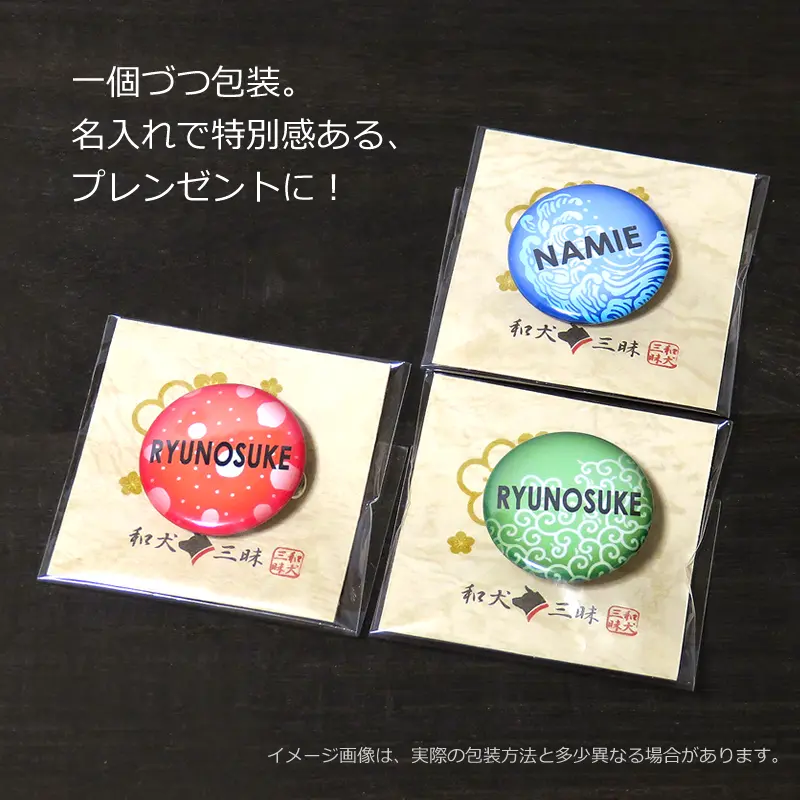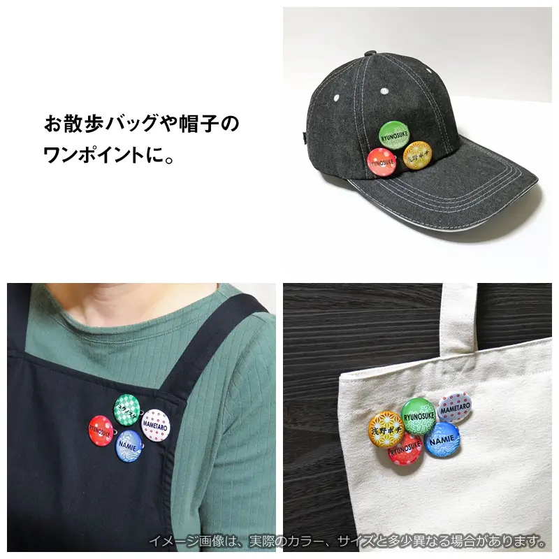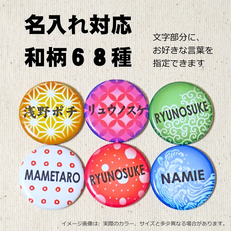 お名前 缶バッジ(和柄)32mm。代表的な日本和柄をデザインした名入れ缶バッジ。好きな言葉で名入れができ、バッグや帽子のワンポイントアクセサリーとしても可愛い。ちょっとしたプレゼントにもおすすめのグッズです。