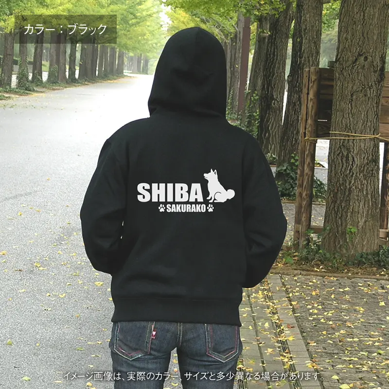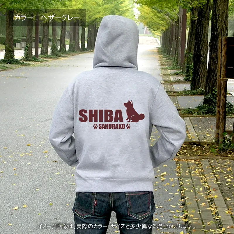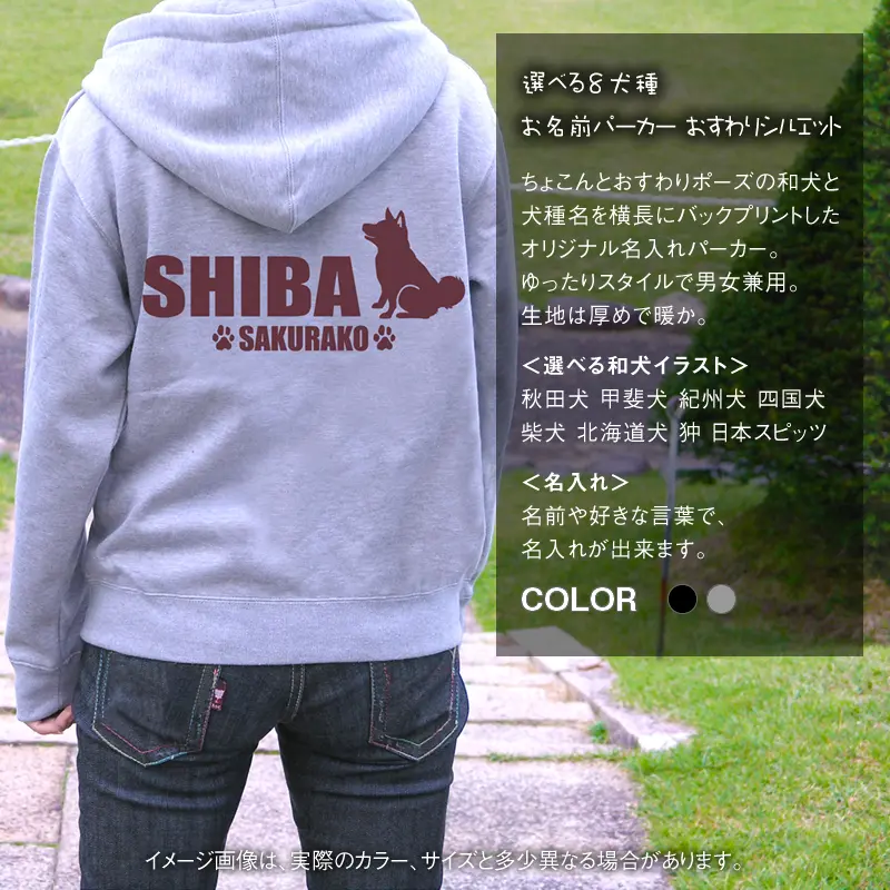 ちょこんとおすわりポーズの和犬と犬種名を横長にバックプリントしたオリジナル名入れパーカー。愛犬の名前やイニシャルなど、お好きな言葉やメッセージを入れて作成します。プレゼントにもオススメなグッズです。
