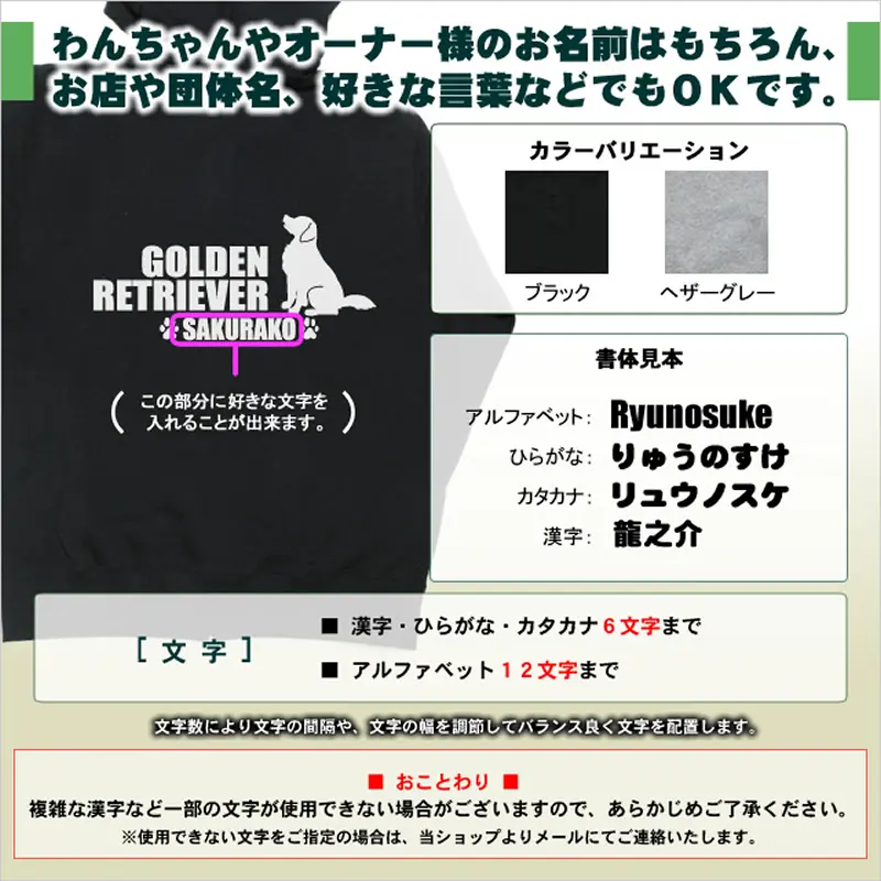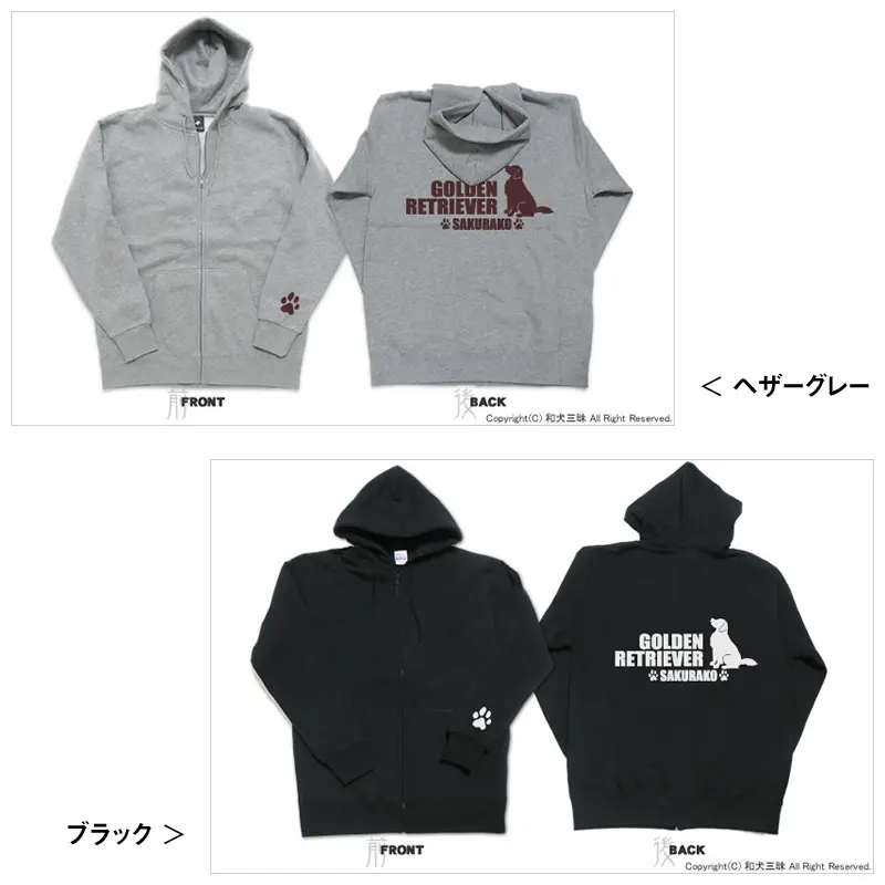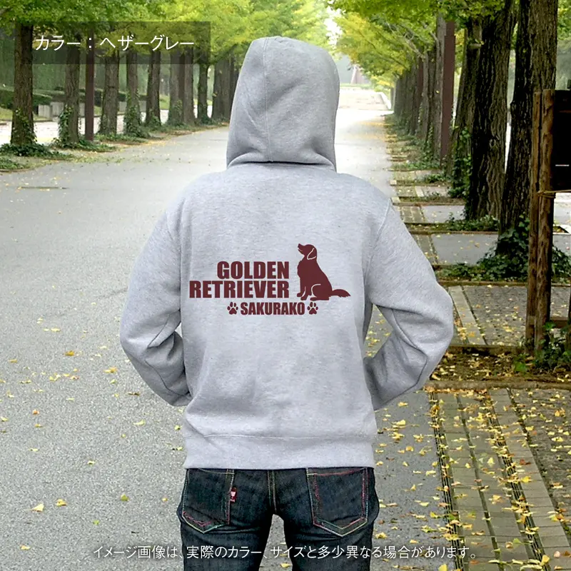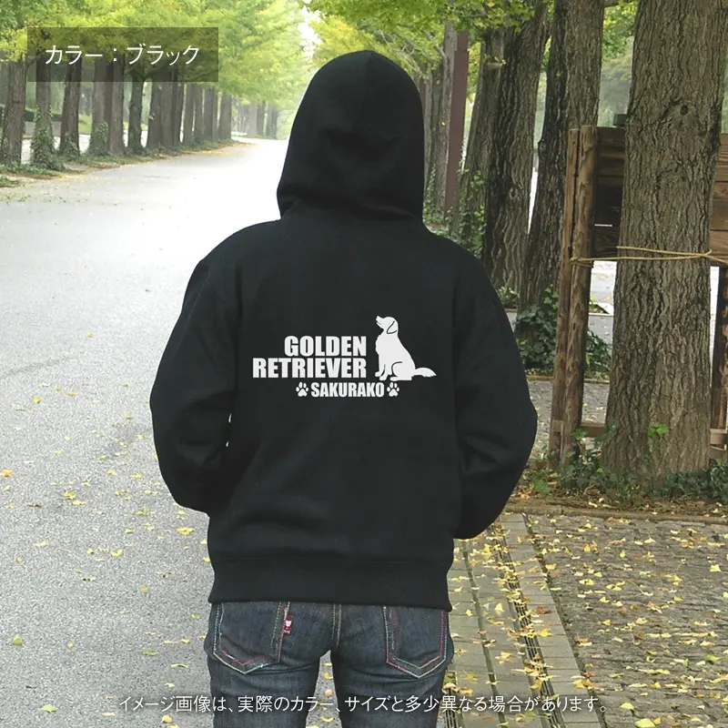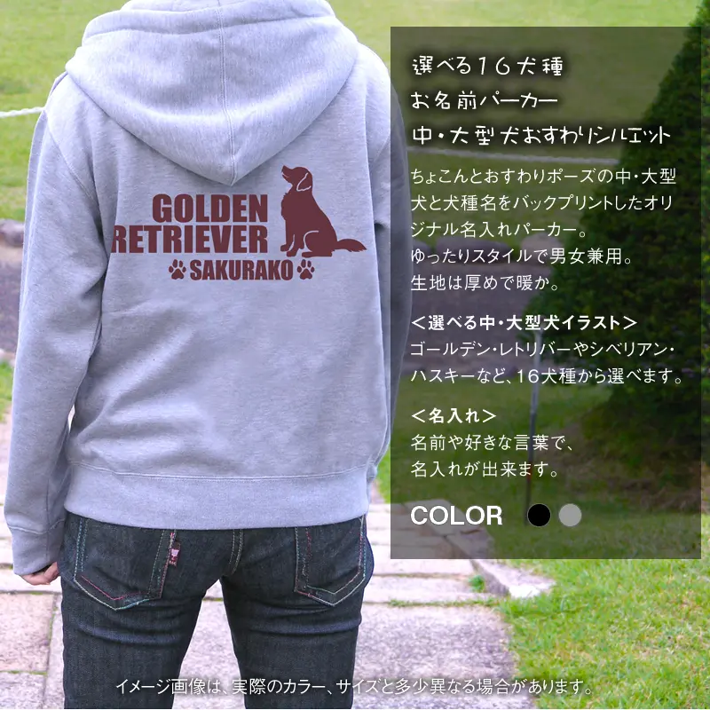ちょこんとおすわりポーズの中・大型犬と犬種名をバックプリントしたオリジナル名入れパーカー。愛犬の名前やイニシャルなど、お好きな言葉やメッセージを入れて作成します。プレゼントにもオススメなグッズです。