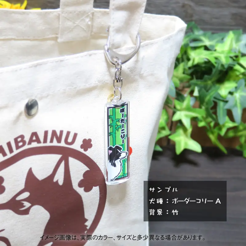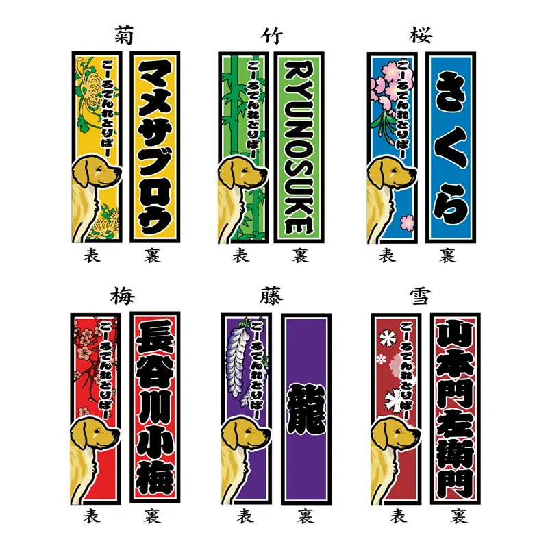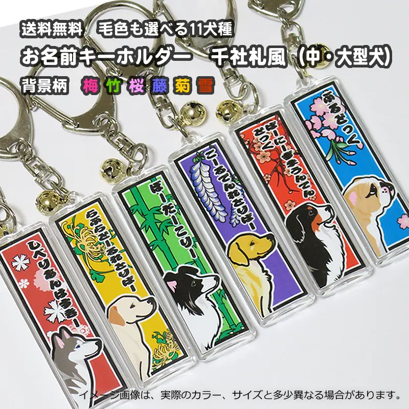 中・大型犬と和柄を千社札風にデザインしたオリジナル名入れキーホルダー。