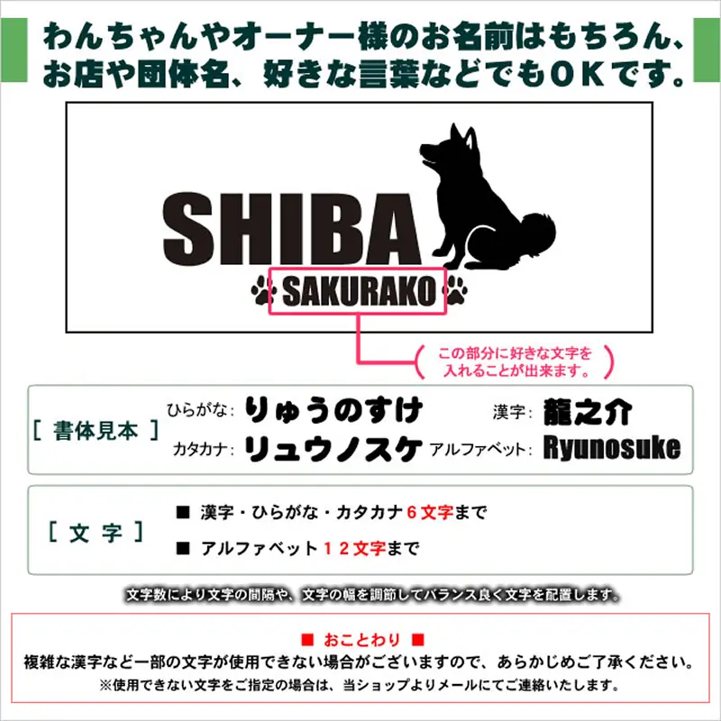 選べる犬種デザインは、和犬8犬種。名前やイニシャルなど、お好きな言葉やメッセージを入れて作成します。