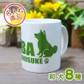 ちょこんとおすわりポーズの和犬と犬種名がデザインされた名入れマグカップ。