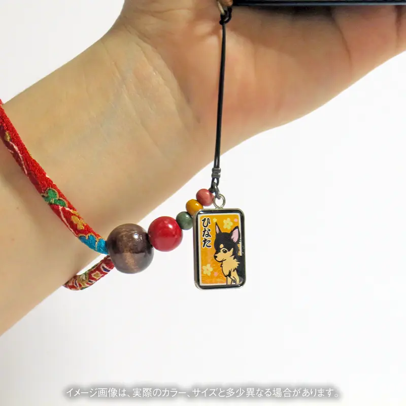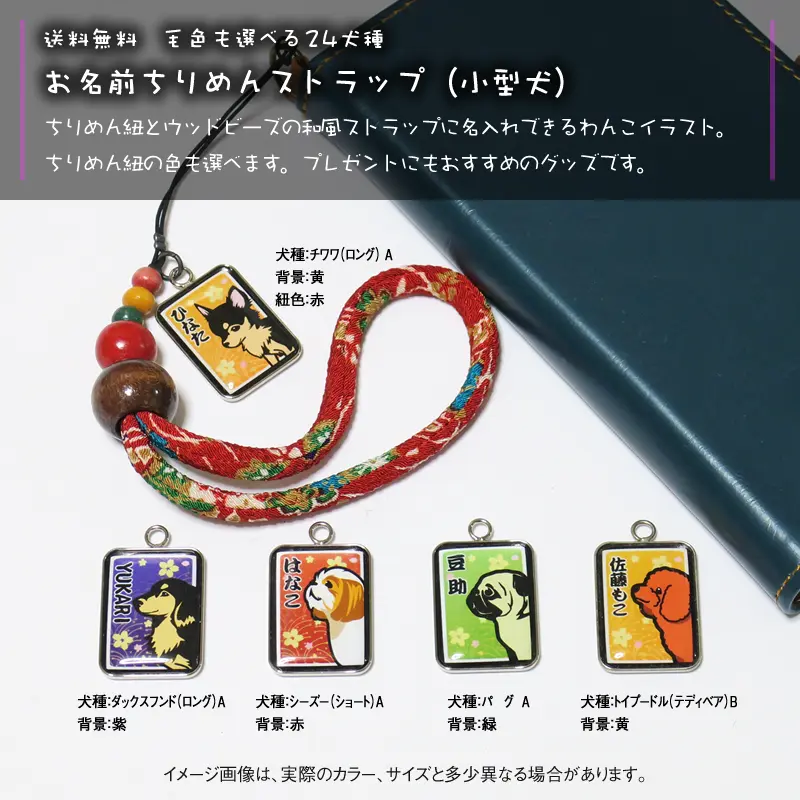 ちりめん紐とウッドビーズの和風ストラップに名入れできるわんこイラスト。 ちりめん紐の色も選べます。プレゼントにもおすすめのグッズです。